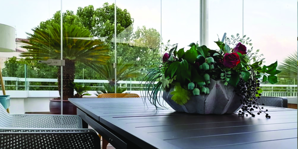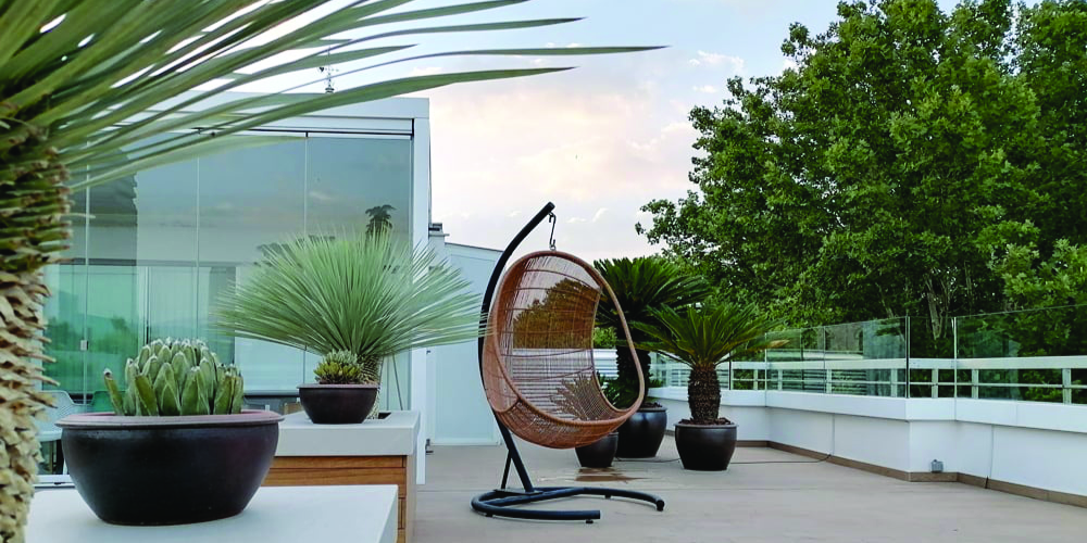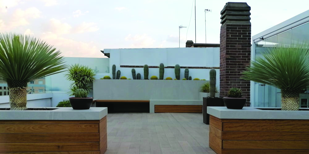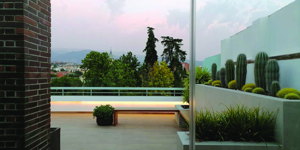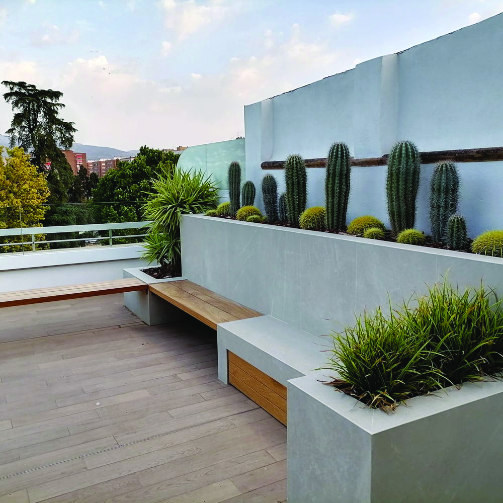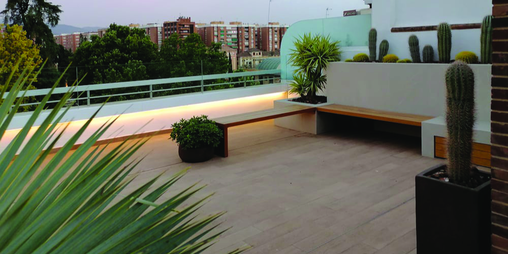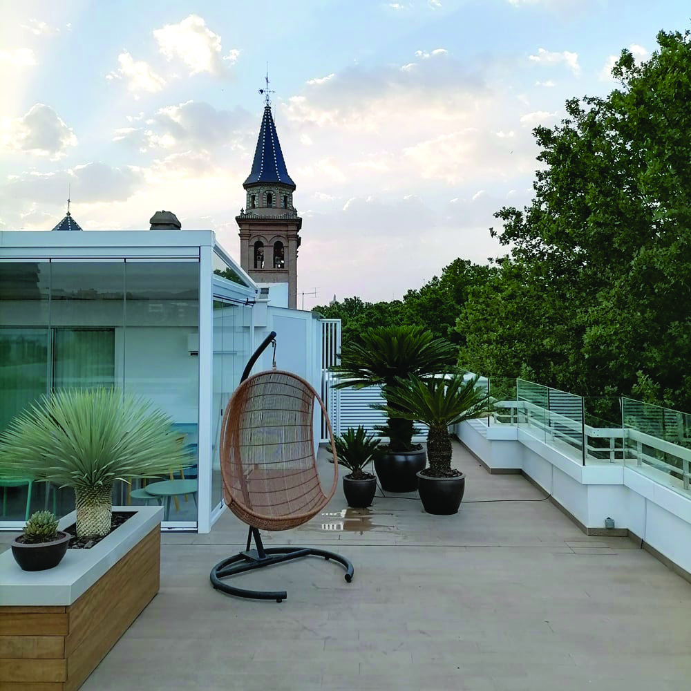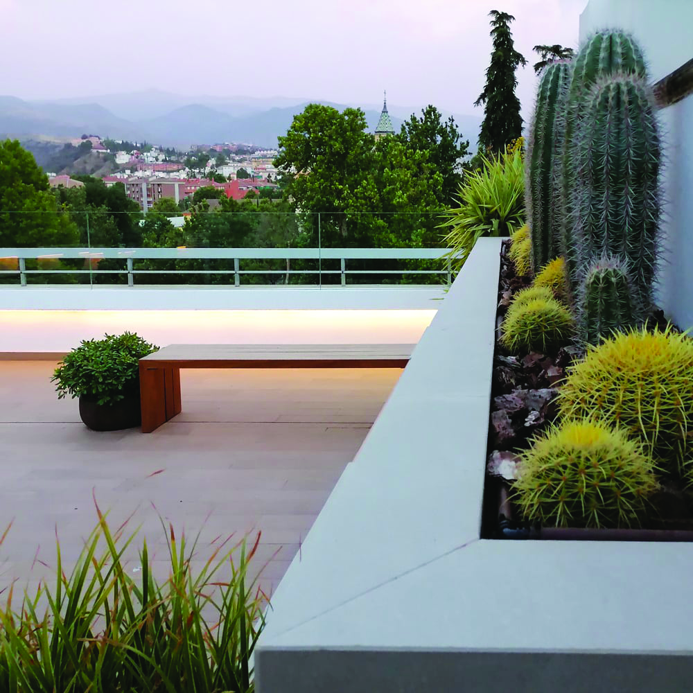 Esta maravillosa terraza del centro de Granada imponía algunos condicionantes importantes: la imposibilidad de cargar pesos en el centro del espacio y la dureza de las condiciones térmicas (en esta zona no es posible usar toldos o pérgolas por protección patrimonial). Es también demasiado amplia (más de 100 m2) para que las jardineras estándar resulten significativas, así que se planteó la construcción de un juego de jardineras y bancos en el extremo del forjado con el fin de poder generar un volumen significativo y ocultar el poco atractivo muro medianero. En la zona central un juego simétrico de dos jardineras móviles, diseñadas expresamente, articulan el espacio.