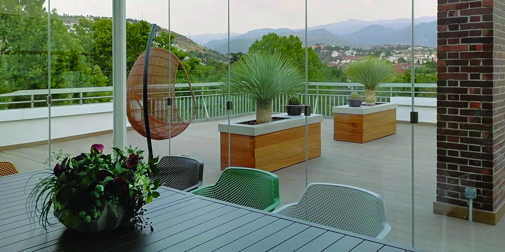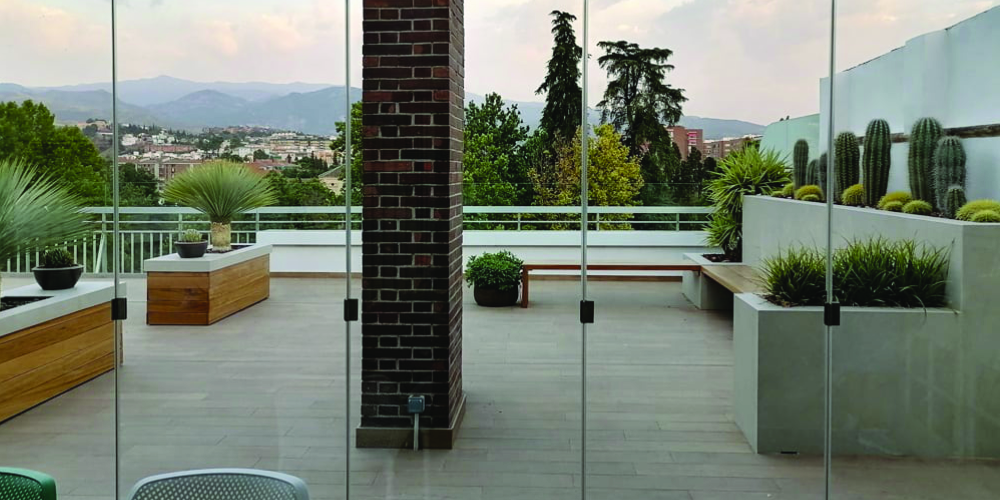 Las jardineras son huecas en su parte inferior y se utilizó un sustrato aligerado. Un quiosco acristalado proporciona las condiciones de confort apropiadas para el uso de este espacio en épocas u horas menos amables, manteniendo el acceso visual al jardín y el paisaje. Tiras led ocultas iluminan el espacio suavemente durante la noche.