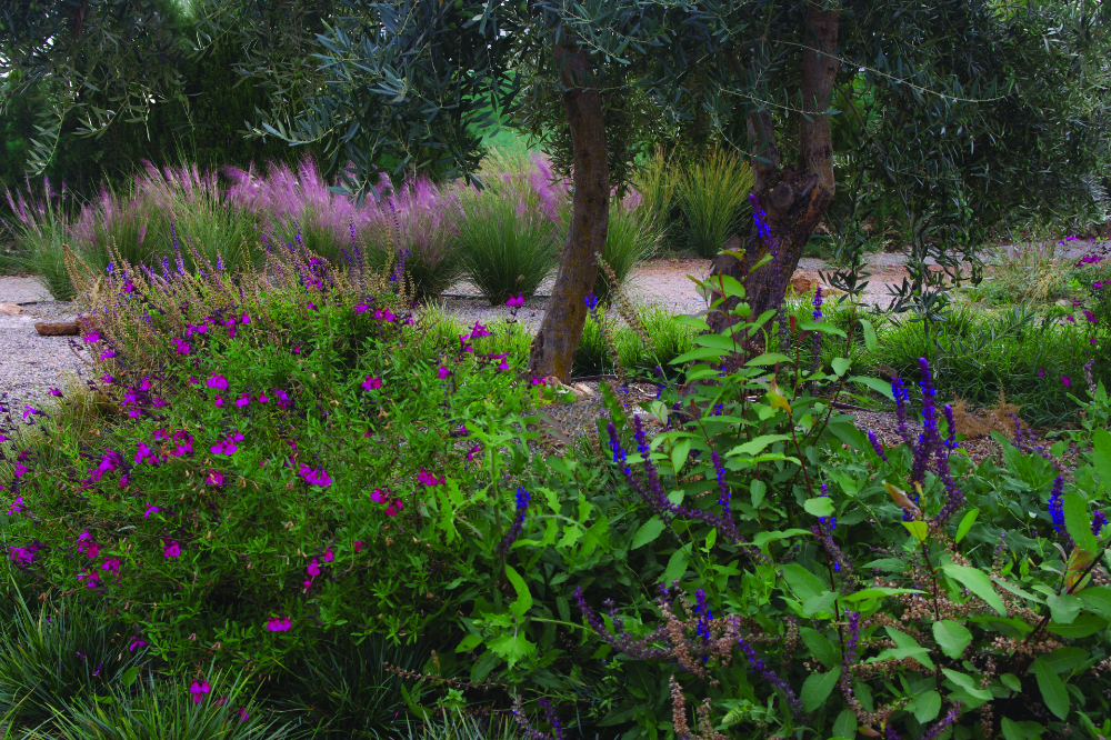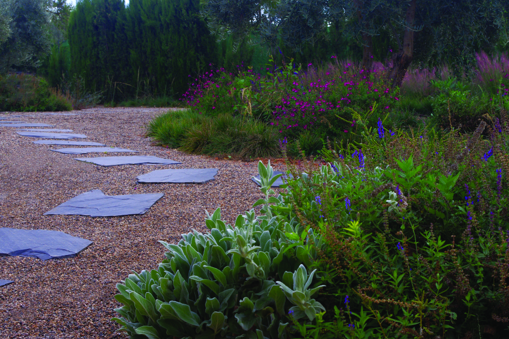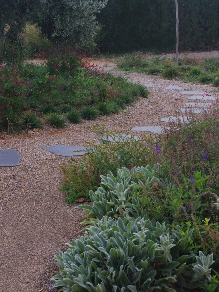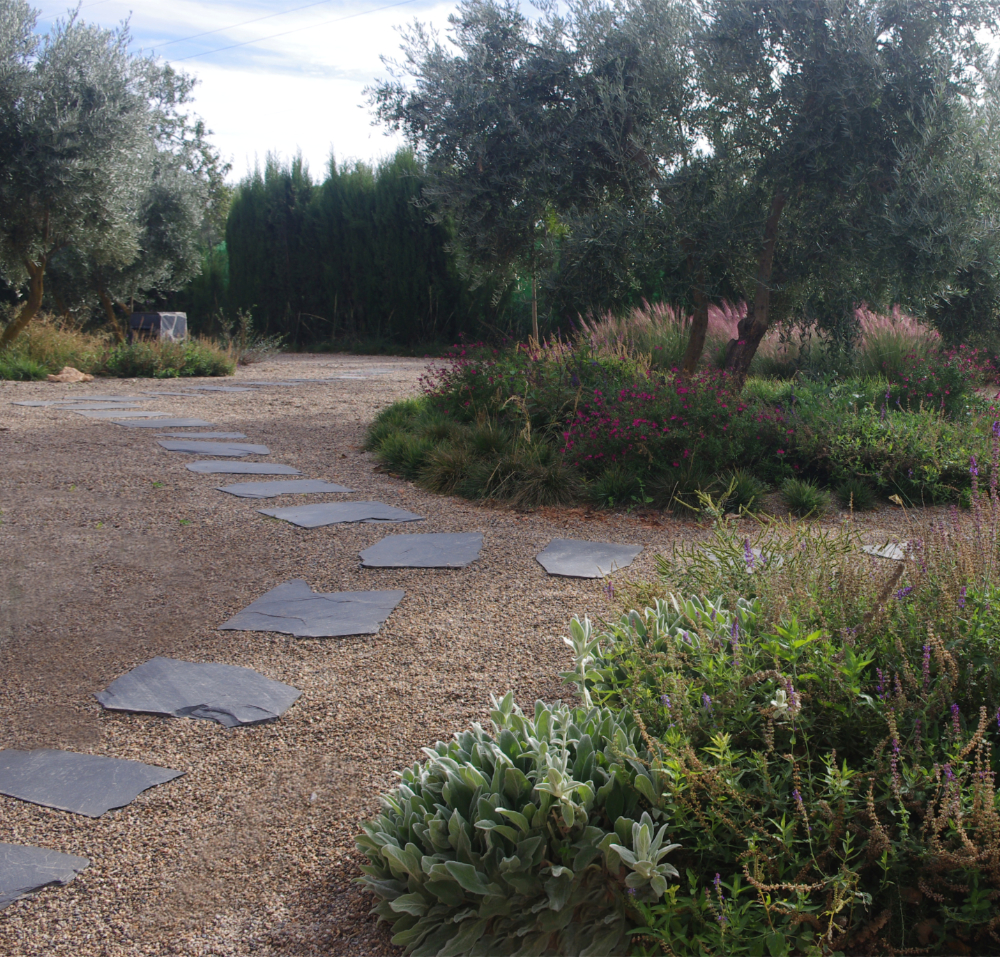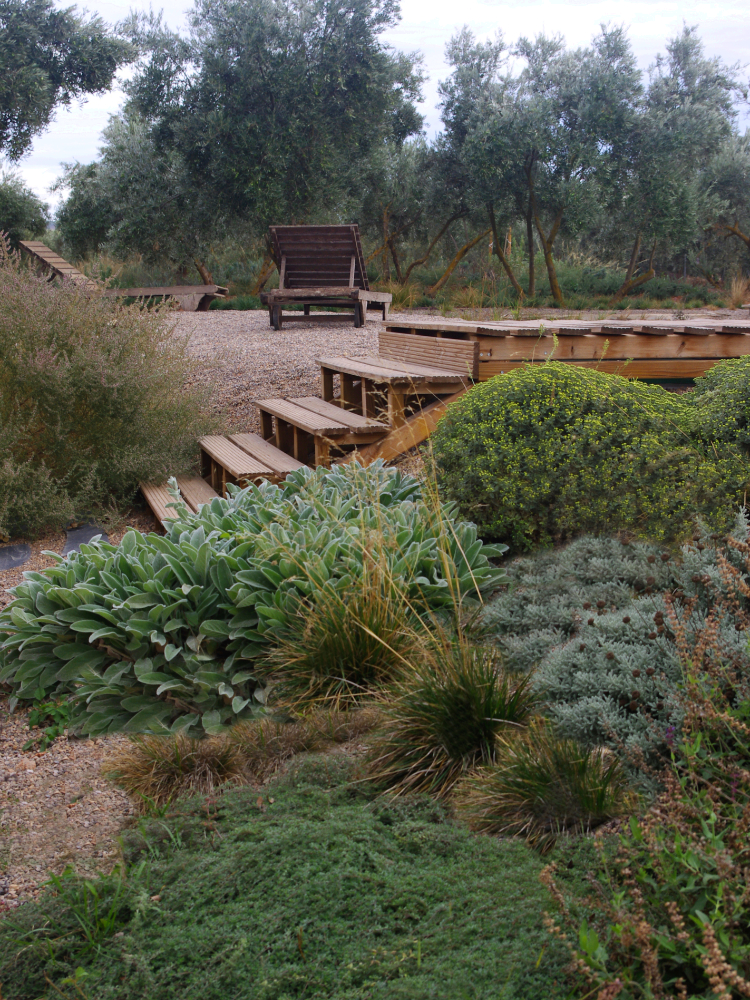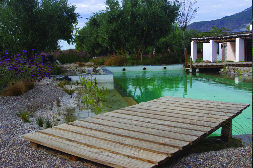 Se creó también un estanque formado por un área de baño rectangular que inunda en su perímetro un área irregular dónde crecen las plantas responsables de la depuración del agua sin aditivos químicos ni sal, permitiendo la vida de la fauna y su utilización para riego. Su aspecto final es el de una alberca de riego con dos pasarelas de madera que facilitan el acceso al área de baño. Con la tierra extraída de la excavación para el estanque se crearon unas “dunas” de forma orgánica que, una vez cubiertas de vegetación, cumplen la función de separar visualmente el espacio de jardín del resto del olivar. Las áreas de tránsito se cubrieron con gravilla de río procedente de una cantera próxima y para facilitar y dirigir el tránsito se crearon pasos de pizarra negra similar a la que la vivienda ya tiene en su cubierta.