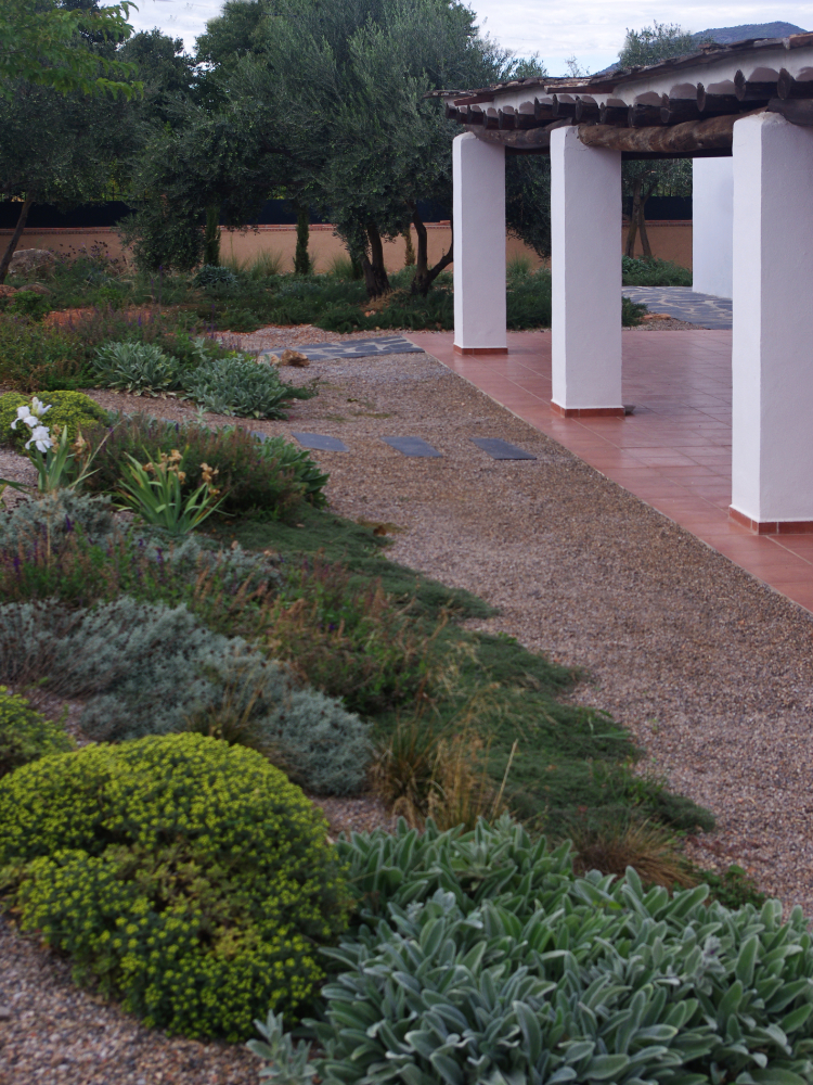 Jardín relizado en una casa de campo de estilo alpujarreño integrada en el interior de una pequeña plantación de olivos en el cañón del río Dúrcal. Se planteó la conservación íntegra del olivar y la incorporación de plantas y elementos propios del entorno con la intención de generar un jardín que, tras unos años, parezca haber surgido de forma espontánea y se mantenga de forma semiautónoma.